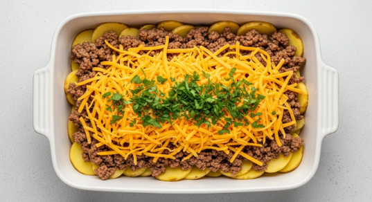 3. In the crockpot, layer half the potatoes, then half the cooked beef and onion mixture, followed by a portion of shredded cheddar cheese. Repeat the layers with the remaining potatoes, beef, and some cheese.