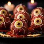 Place half a mozzarella ball on each meatball, then top with a sliced olive “pupil.” Return to the oven just 1–2 minutes to melt slightly. Serve warm — and watch guests laugh (or scream).